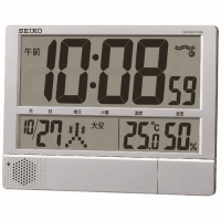 ●外形寸法(幅)[mm]:386●外形寸法(奥)[mm]:31●外形寸法(高)[mm]:294●質量[kg]:1.3●色:銀色メタリック●使用電池:単3形アルカリ乾電池×6本(電池寿命約1年)●電波受信機能:有●機能:プログラム機能(32CH)、電波OFF機能、フルオートカレンダー、高コントラスト液晶、電池切れ予告機能、六曜表示、掛置兼用●精度:温度=+-2度(0度~+40度の間)、湿度=+-8%(温度25度で25%~85%RHの間)