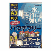 レーザープリンタで印刷するだけ!紙厚 220マイクロメートル ラミネート加工不要な耐水紙。●入数:100枚●寸法:A3(303×426mm)●紙厚:120マイクロメートル●坪量:★★●白色度:ホワイトNESS●生産国:日本●規格:A3(303×426mm)●材質:PET
