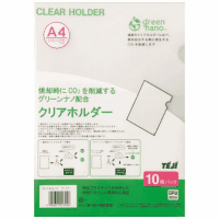 焼却時に発生するCO2を削減するグリーンナノを配合したクリアーホルダー。●入数:10枚●外形寸法(縦)310mm●外形寸法(横)220mm●色:クリア●厚:0.2mm●規格:A4●材質:ポリプロピレン
