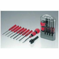 力の入る電工ラバーグリップのセット。先端マグネット付きで耐久性のある全体焼き入れ仕様。●質量310g●ケース寸法:幅100×奥行40×高さ170mm●セット内容:ドライバー(+0、+1、+2、-2.5、-5.5、-6)、針、ギムネ、グリップ、ヒートン回し●材質:モリブデン、バナジウム鋼、アセテト樹脂、エラストマー樹脂●材質2:差替式電工グリップ/PP、TPE●材質3:ピートン回し/PP
