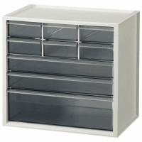 ●レターケース●小物入れ●本体樹脂製●引出し:小浅型6段(2段×3列)・大浅型2段・大深型1段●外寸:幅308×奥210×高290mm●引き出し内寸:小浅型=幅85×奥192×高37mm、大浅型=幅279×奥192×高37mm、大深型=幅279×奥192×高83mm、●色:ライトグレー●材質:本体=ハイインパクトスチロール樹脂、引出し=スチロール樹脂●見出し紙なし