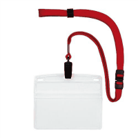 ●吊り下げ名札●ソフト●チャックタイプ●色:赤●中紙サイズ:縦69×横97mm●ひもの長さ:90cm●ひもの幅:10mm●1パック入数:10枚●中紙付●外寸:縦91×横108mm●材質:名札ケース=ポリオレフィン、ループひも=PET●仕様:チャック式、安全パーツ・長さ調整具付●適合中紙寸法:縦69×横97mm