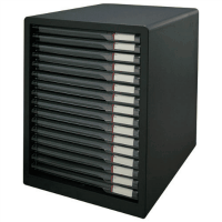 ●書類を細分化できるスリムタイプ。●レターケース●本体樹脂製●タテ型A4●引出し:浅型16段●幅265×奥350×高345mm●引出し内寸:幅230×奥320×高14mm●材質:本体=ハイインパクトスチロール、引出し=スチロール樹脂●付属品:見出しシール(1枚20片)