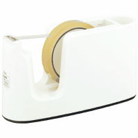 ●テープカッター●色:ホワイト●巻きサイズ:大巻・小巻両用●外形寸法:幅70×奥218×高120mm●最大テープ幅:24mm●最大テープ外径:107mm●質量:約1.4kg●材質:本体=PP、底板=ABS、扉バネ=POM