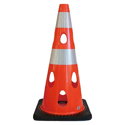 穴の開いた形状により強風や水害に強く倒れにくいカラーコーン。ベース一体型です●外形寸法(幅):360mm●外形寸法(奥):360mm●外形寸法(高):700mm●質量:約3100g●色:赤●材質:本体=PVC、ベース=ゴム