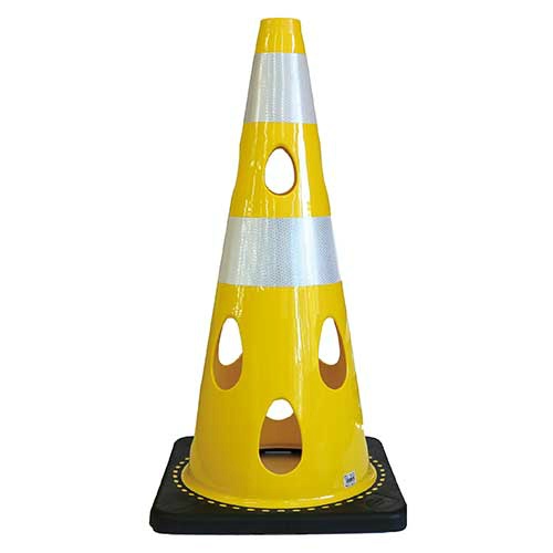 穴の開いた形状により強風や水害に強く倒れにくいカラーコーン。ベース一体型です●外形寸法(幅):360mm●外形寸法(奥):360mm●外形寸法(高):700●質量:約3100g●色:黄●材質:本体=PVC、ベース=ゴム