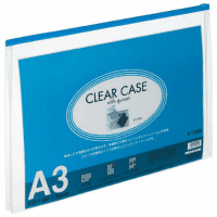 ●クリアケース●ヨコ型●マチ付●見出し付●規格:A3-S●外形寸法:縦337×横470mm●色:本体=透明・ファスナー部=藍●マチ幅:30mm●材質:オレフィン●厚:0.3mm●収容枚数:コピー用紙200枚●本体左下に見出し付