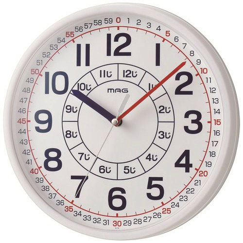 ●とけいの読み方・教え方のコツがわかる知育時計●外形寸法:直径280mm、厚さ:49mm●質量:0.42kg●色(縁):ホワイト●秒針:ステップ秒針●使用電池:単3形マンガン乾電池×1本(別売)●電池寿命:約1年●精度:月差30秒