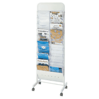 ●外寸:幅540×奥行350×高さ1520mm●質量:11.5kg●内寸:W213×D34×H297mm●カラー:ホワイト・クリア●材質:フレーム=スチール角パイプ、ラック=ポリスチレン●上部ポップ部分寸法:W480×H134mm●最大積載質量:30kg●収納可能厚:34mm●適合サイズ:A4●キャスター(ストッパー付2無2)付●スタッキング可能●組立品●翌日配送対象外商品 約3日のお届けです(例外あり)