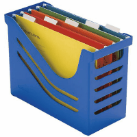 ●ボックスファイル●樹脂製●規格:A4-E●色:ブルー●材質:本体=ポリプロピレン、ハンギングファイル=紙、ハンガー=スチール●外形寸法:幅152×縦250×横357mm●内形寸法:幅147×縦245×横328mm●ハンギングファイル5枚付(イエロー、レッド、オレンジ、グリーン、ブルー各1色)
