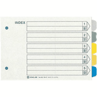 ●インデックス●ヨコ型●規格:B6-E●インデックス寸法:縦19×横10mm●穴数:2穴●仕様:5色5山6枚1組●入数:10組●材質:色クラフト紙●外形寸法:縦128×横192mm●穴間隔:80mm
