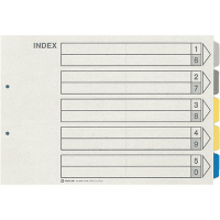 ●インデックス●ヨコ型●規格:B4-E●インデックス寸法:縦39×横10mm●穴数:2穴●仕様:5色5山6枚1組●入数:10組●材質:色クラフト紙●外形寸法:縦257×横374mm●穴間隔:80mm