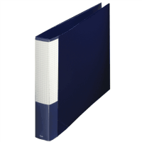 ●リングファイル●ヨコ型●丸型リング●内ポケット無●規格:B4-E●適正収容数:210枚●背幅:35mm●色:ネイビー●材質:表紙=ポリプロピレン●表紙厚:1.5mm●外形寸法:縦267×横394mm●穴数:2穴●穴間隔:80mm●リング内径:26mm●背見出し交換タイプ●紙押さえ2枚付