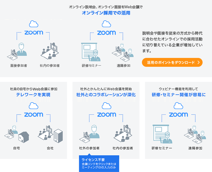 ZoomはWeb会議だけではなく、ウェビナーや非対面での教育研修など様々なシーンで活用され、現在、世界シェアNo1のクラウド型Web会議サービスです。