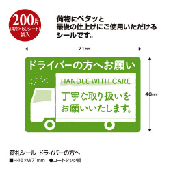 送り主の『想い』が伝わるシール!荷物にペタっと最後の仕上げ!いつもの荷札が特別なお届けものに変わります。ちょっとした心づかいが相手側に届きます。●寸法/34×46mm●材質/コートタック紙●種別/ドライバーの方へ●サイズ/縦46mm×横71mm●単位/1冊(200片(4片×50シート))