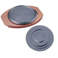 電磁調理器対応表:うず状の溝になっており、余分な油がカットされ、熱がムラなく伝わります。ステーキ皿のサイズ表示は鉄板の外寸法になります。焦げにくく、保温力に優れています。暖めた鉄板の熱で、ステーキ肉をお好みの レア・ミディアム・ウェルダムとおいしく焼き上げます。●(外寸)外径(mm)/230●(内寸)内径×高さ(mm)/205×11●質量(g)/2500●(木台)幅×奥行(mm)/322×240●単位/1個