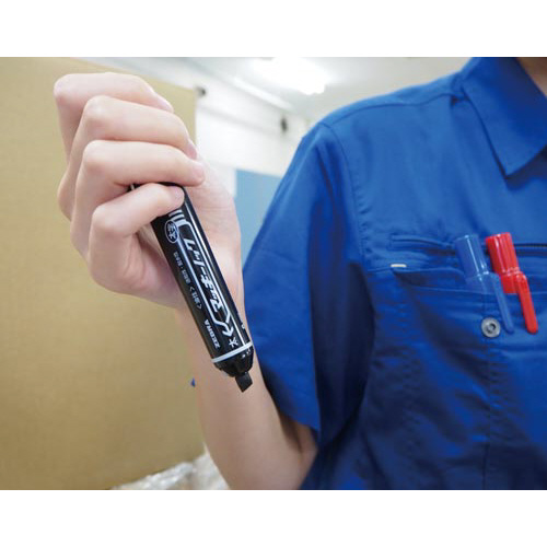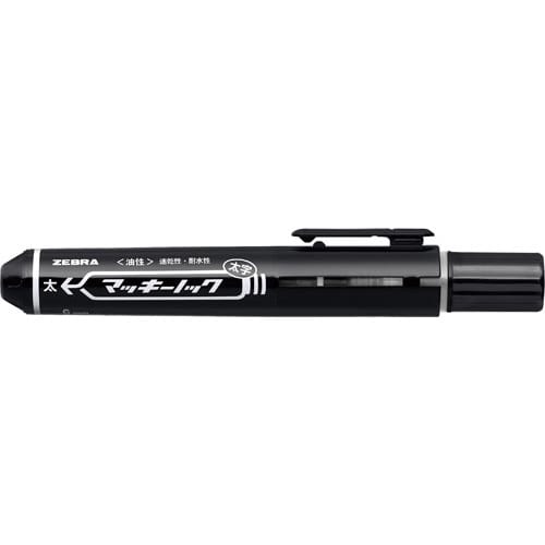片手で使えて太い文字が素早く書けるノック式油性マーカー。キャップ紛失の心配がありません。速乾性・耐水性がある油性インクなので、紙・布・ガラス・プラスチック・金属・ビニール類など幅広く利用できます。●線幅/約6mm●ペン先/太字角芯●インク色/黒●インク種類/油性染料インク●タイプ/ノック式●仕様/セリースパック入り●単位/1本