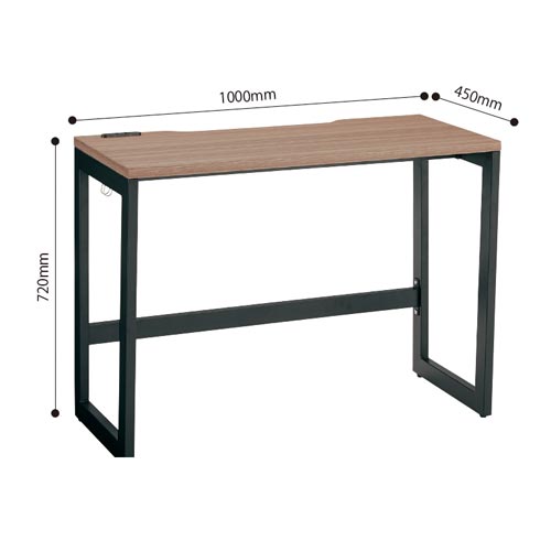 働き方が広がるデスクシリーズ。デスク、フリーアドレスデスク、ハイデスク、ミーティング用テーブル、シェルフのカラーリングを統一できます。●種別/幅1000●タイプ/脚:ブラック●カラー/天板:ウォルナット●外寸法/幅1000×奥行450×高さ720mm●下肢空間寸法/幅947×奥行328×高さ645mm●天板厚さ/25mm●質量/15.4kg●材質/天板:(表面)メラミン化粧板(エッジ)PVC、脚部・フレーム・配線受け:スチール(粉体塗装)、フック:スチール(クロームメッキ仕上げ)、コンセント:合成樹脂、アジャスター:PP●耐荷重/天板:約40kg●機能/2個口コンセント、配線受け、フック(1個)●付属工具/六角レンチ●生産国/中国●単位/1台