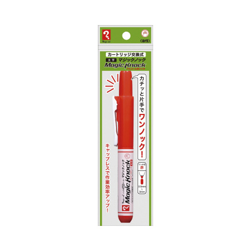 カチッとワンノックするだけでスグにつかえます!専用カートリッジの詰め替えも簡単で経済的!●インク色/赤●インク種類/アルコール系油性染料●ペン先/太字●線幅/約2.5から3mm●タイプ/詰め替えタイプ●寸法/152×21.5×16mm●質量/18g●ノック式●詰め替えカートリッジ品番/MHJKF-T2●単位/1箱(10本入)