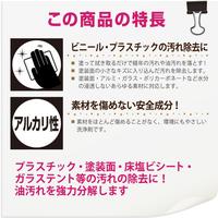 ハウスクリーニングのプロが「汚れた素材・場所の種類」、「汚れの原因」に応じて開発した高性能クリーナー。「驚きの洗浄力」でこれまで中性洗剤では落ちなかったビニール・プラスチック製品の汚れを落とします。●使用前に目立たないところでお試しいただき、素材への影響などをご確認ください。●【用途】/電化製品・換気扇・浴槽・浴室小物などプラスチック製品や塩ビシート、テントなどの黒ずみ・油汚れの除去に●容量/100ml●商品サイズ(幅×奥行×高さ)/85×50×200●商品重量(g)/171●塗り面積(m2)/約1ー2●使えないもの/布や白木など素材に染み込むものには使用できません。※使用前に目立たないところでお試しいただき、素材への影響などをご確認ください。●液性/酸性●単位/1個