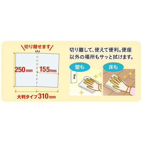 大判サイズで、床や壁までしっかり拭ける!シートを半分にカットできるミシン目入りで、半分ずつでも拭けて経済的!使用後はそのまま便器に流せます!●香り/せっけん●シート寸法/約250×310mm、ミシン目入(カットサイズ:約250×155mm)●材質/パルプ100%●成分/エタノール、防腐剤、香料、クエン酸●液性/弱酸性●入数/1個あたり15枚入●単位/1セット(2個入×18)