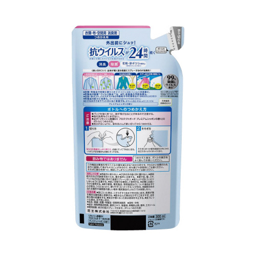 外出前の使用で抗ウイルスが12時間続く。●種別/詰替用●容量/300ml●香り/プレミアムシャボン●使用範囲の目安/布製品対象物から20-30センチ離し、全体が軽く湿る程度にスプレーする。●仕様/衣類・布・空間用消臭剤詰替●単位/1パック