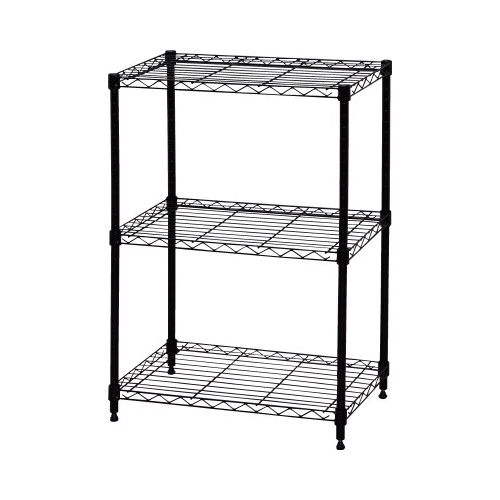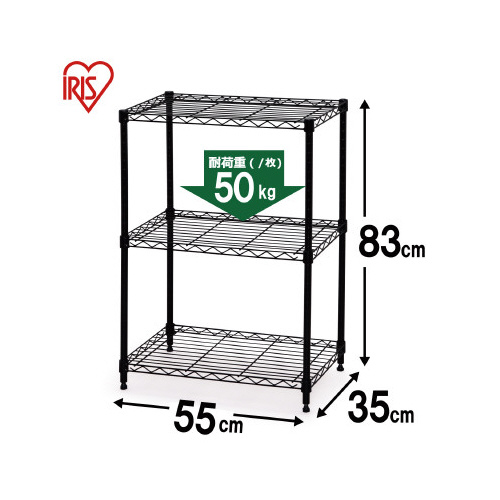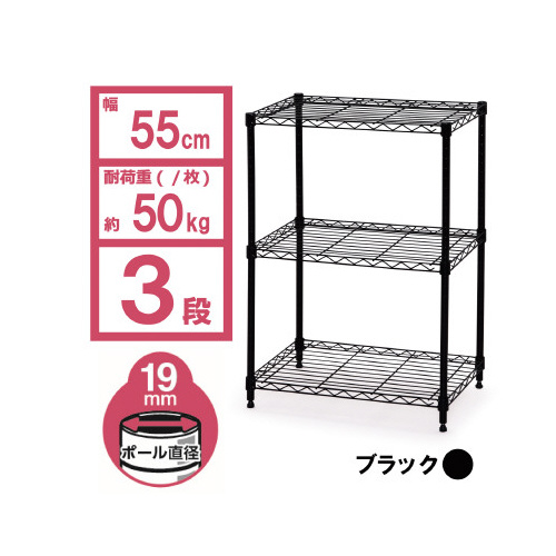 【3段】【幅55×奥行35×高さ80cm】【ポール直径19mm】【ネジ・クギ等不要の簡単組み立て】設置場所の雰囲気に合わせて選べるカラーメタルラックです。すっきり配置できるアジャスター仕様です。●外寸法/高さ800×幅550×奥行350mm●材質/棚板・ポール:スチール(粉体塗装)、棚板固定部品:ABS樹脂、アジャスター:スチール、ナイロン樹脂●質量/5.3kg●耐荷重/全体:100kg、棚板1枚あたり:50kg●生産国/ベトナム●カラー/ブラック●単位/1台