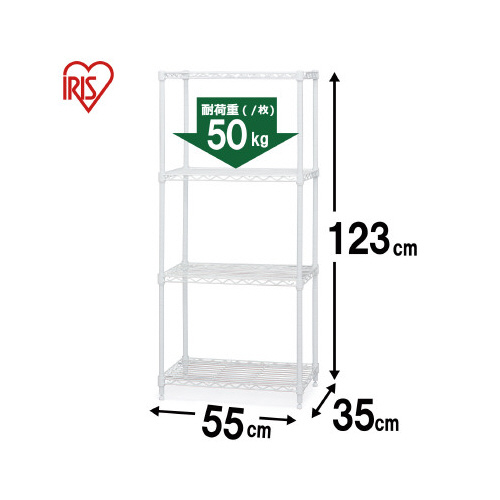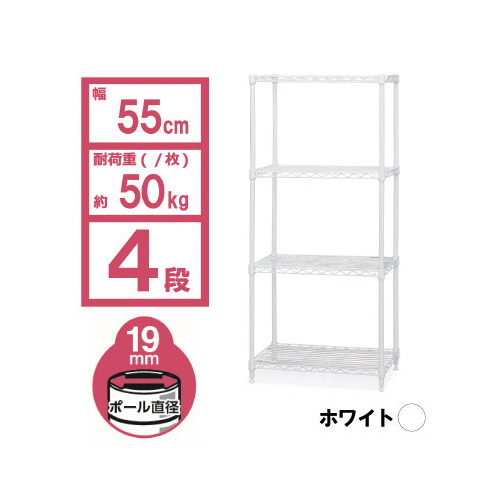 【4段】【幅55×奥行35×高さ123cm】【ポール直径19mm】【ネジ・クギ等不要の簡単組み立て】設置場所の雰囲気に合わせて選べるカラーメタルラックです。すっきり配置できるアジャスター仕様です。●外寸法/高さ1230×幅550×奥行350mm●材質/棚板・ポール:スチール(粉体塗装)、棚板固定部品:ABS樹脂、アジャスター:スチール、ナイロン樹脂●質量/7.6kg●耐荷重/全体:100kg、棚板1枚あたり:50kg●生産国/ベトナム●カラー/ホワイト●単位/1台