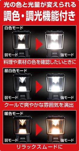 白色、暖色点灯モデル。充電池と乾電池を併用可能。給電機能もついており、防災やレジャーなど様々なシーンにて活躍するランタン。●電池寿命/6時間-270時間●寸法/直径102.2×高さ189mm●質量/680g(電池含む)●付属品/ハンガーフック、MicroUSBケーブル(50cm)、専用充電池●保証期間/1年●光源/高輝度チップタイプLED×3、高輝度チップタイプ暖色LED×2●単位/1セット(3個入)