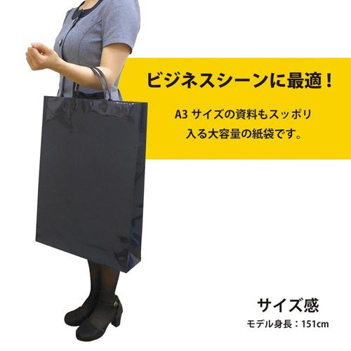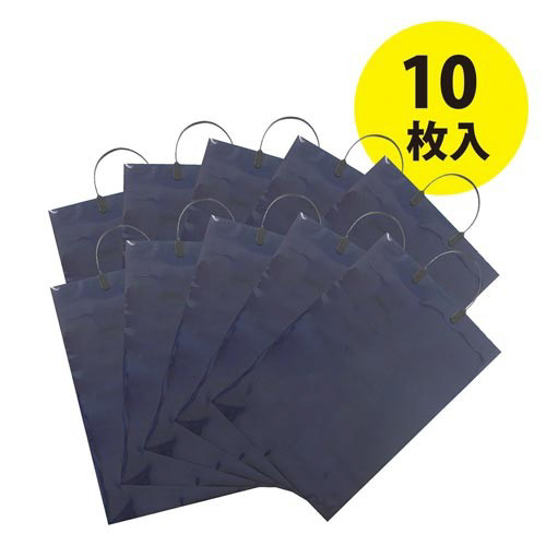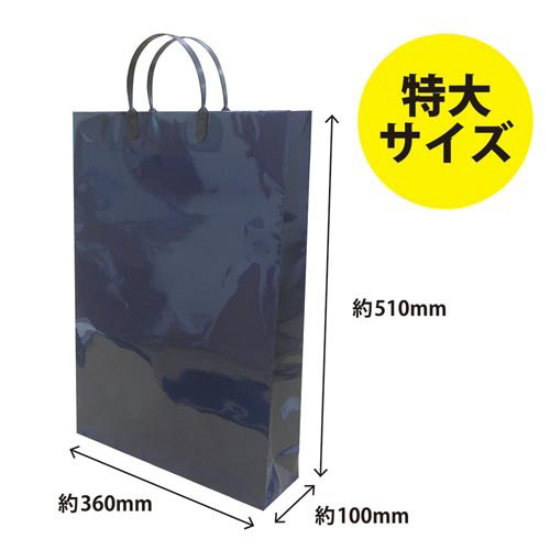 カラーはネイビー。表面はラミネート加工をしており丈夫で、光沢があり見た目もキレイ。持ち手はハッピータックで強度がある。口が留められる仕様になっており、留め外しも簡単。10枚パックでまとめ買いに便利。●サイズ/特大●機能/グロスラミネート加工●カラー/ネイビー●材質/コート紙(157g/平方メートル)●持ち手形状/ハッピータック●寸法/幅360×高さ510×マチ100mm●枚数/10枚●単位/1箱(10枚入)