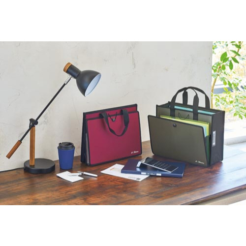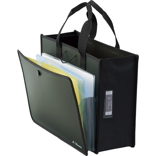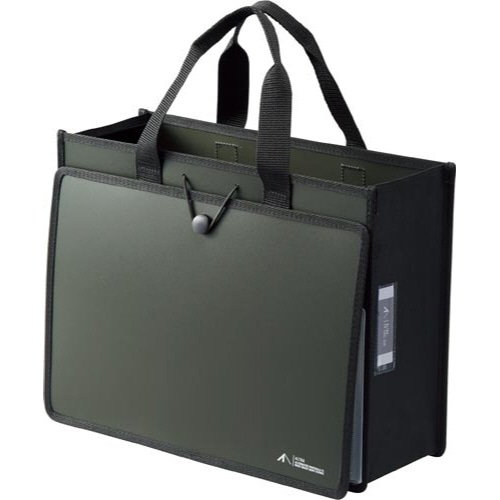 折りたたみ式のPP製ツールバッグ。書類整理に便利なジャバラポケット付き。●種別/ヨコ型●カラー/オリーブ●寸法/折りたたみ時:タテ277×ヨコ360×厚さ25mm●外寸法/タテ277×ヨコ360×厚さ150mm(ハンドル除く)●材質/本体:PP、ポリエステル●耐荷重/8kg●機能/折りたたみ式、ジャバラポケット(1仕切り)付き、側面:メッシュポケット・見出し(ポケット)付き●単位/1箱(10個)