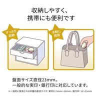 乾きが早い!印影がキレイ!携帯に便利なプチサイズの朱肉!20mm丸までの印鑑に対応!コンパクトだから、収納しやすく携帯にも便利です。●盤面寸法/直径23mm●本体寸法/幅38.5×奥行38.1×高さ14.6mm●対応インク/OG-20●フタ仕様/本体付蓋●単位/1個