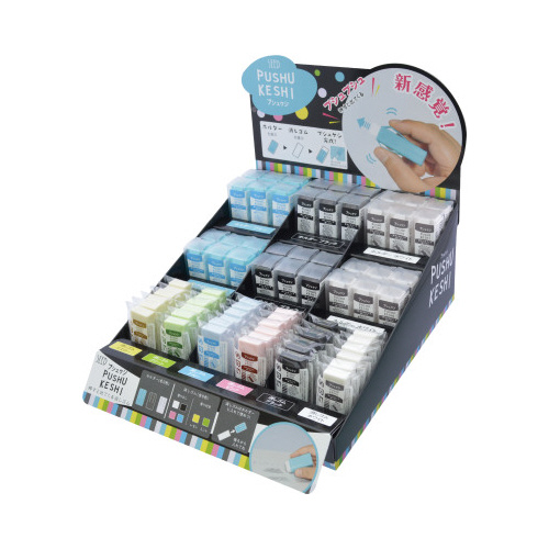 ホルダーをプシュプシュ押すと消しゴムが出てくる。ホルダーは全3色消しゴムは全6色。好きな色を組み合わせて自分だけのプシュケシが完成●寸法/タテ54.5×ヨコ19.8×高さ10.8mm●材質/PVC●カラー/ホワイト●単位/1個
