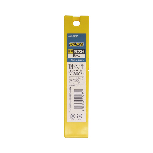 耐久性重視! ハードな作業用の特大H型刃(プラケース入)。適合本体:H型、ノンスリップH型、ハイパーH型●種別/替刃●寸法/140×25mm●材質/合金工具鋼●刃厚/0.7mm●刃幅/25mm●商品名/カッター替刃●概要/刃幅25mmの特大サイズH型専用刃。1パック入(5枚入)。●全長/140.0×25.0×0.7mm●単位/1パック(5枚入)