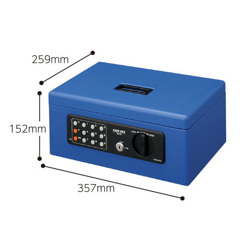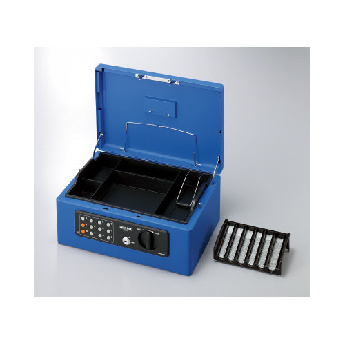 鍵なしで解錠できるテンキータイプ。暗証番号は、0から9の数字を最大で8桁まで自由に組み合わせて設定できるので、より高いセキュリティレベルが期待できます。●サイズ/A4●カラー/青●寸法/外寸法:幅357×奥行259×高さ152mm●内寸法/幅307×奥行228×高さ84mm●材質/本体:鋼板(焼付塗装)、前面パネル:ABS、トレー:再生ABS●質量/4.2kg●付属品/鍵2個付、単4形乾電池4本付(お試し用)、セキュリティスロット付●錠タイプ/シリンダー錠・テンキー●その他機能/フタはね上げ調節付き、書類押さえ(フタ裏)付き●種別/コインカウンター付きトレー●仕様/コインカウンター付トレー、シリンダー錠、プッシュボタン錠、セキュリティスロット●単位/1台