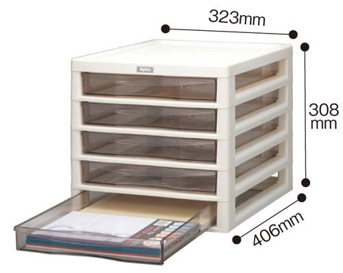 角2封筒がそのまま入るB4サイズ!●サイズ/B4●種別/浅型5段●カラー/アイボリー●外寸法/幅323×奥行406×高さ308mm●引出内寸法/幅268×奥行379×高さ39mm●材質/本体:PP、引出:PS●質量/約2.8kg●付属品/見出しシール●単位/1個