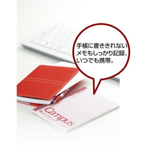 ミニノートがとっても便利!ハガキと同じサイズで「コンパクト」だからいつも一緒。大切なメモは、キャンパスミニノートで決まり!持ち歩きにグッド!●サイズ/A6(5号)●種別/A罫●寸法(タテ×ヨコ)/148×105mm●紙質/上質紙(森林認証紙)●製本様式/無線とじ●罫内容/普通横罫●罫/7mm幅●行数/18行●枚数/48枚●規格/JIS規格品●単位/1セット(5冊入)