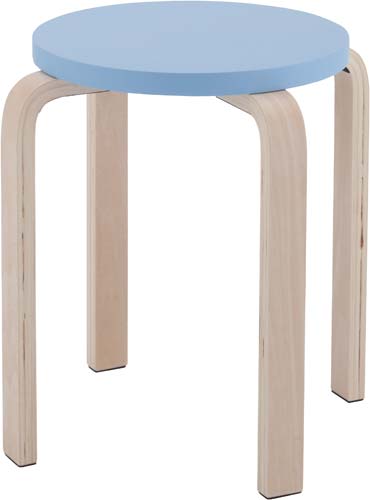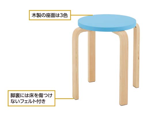 優しい座面カラーが学校などに最適!脚裏には床を傷つけないフエルト付き。4脚までスタッキング可能です。●カラー/ブルー●外寸法/幅420×奥行420×高さ440mm●座面寸法/直径340mm●座面高さ/440mm●材質/座:積層合板(ウレタン塗装)、脚:積層合板、床接地面クッション材:フェルト●質量/2.7kg●スタック可能数/4脚●生産国/台湾●単位/1箱(4脚入)