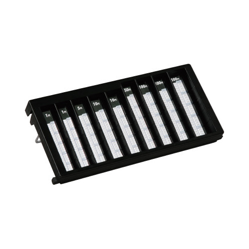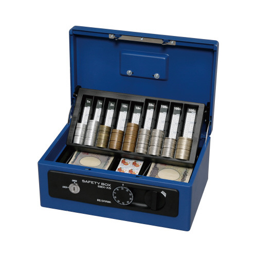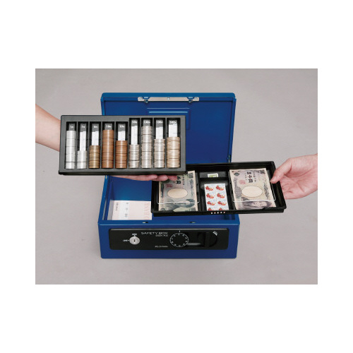 フタを開けるとコイントレーがスライドアップ!取り外して、コインカウンターとしてもお使いいただけます。簡易レジとしてもどうぞ。●サイズ/A5深型●カラー/ブルー●内寸法/幅245×奥行150×高さ90mm(有効内寸)高さ45mm●材質/本体:スチール、トレー・前パネル:再生ABS樹脂●質量/1.8kg●付属品/鍵2個付●外寸法/幅275×奥行185×高さ120mm●機能/コインカウンター付トレー、シリンダー錠、ダイヤル錠●単位/1台