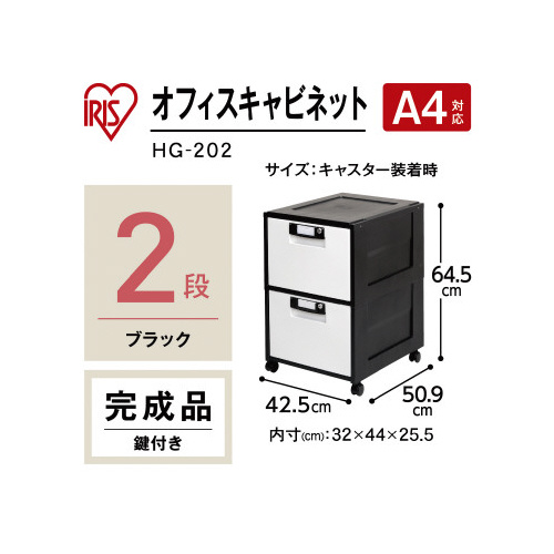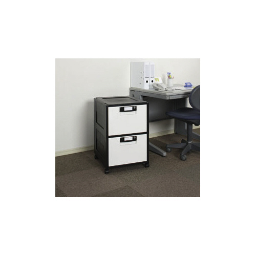 ファイル収納におすすめな鍵付きオフィスキャビネット深型2段タイプです。インナーケースやA4ファイルの収納におすすめなサイズです。引き出しやすい金属レールを採用しています。移動に便利なキャスター付きです。●外寸法/約幅425×奥行509×高さ645mm●引出し内寸法/約幅320×奥行440×高さ255mm●質量/約7800g●材質/ポリプロピレン、アルミ、スチール●耐荷重/引き出し1段あたり:15kg、全体:30kg●キャスター仕様/ストッパーなし●付属品/鍵2個付き●単位/1台