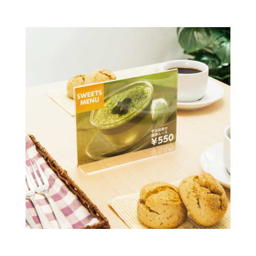 案内板として、メニューやアピールしたい印刷物などをきれいに見せるアクリル製のサインホルダー。●サイズ/A4横●外寸法/298×86×215mm●カード寸法/297×210mm●厚さ/1.8mm●材質/アクリル樹脂●種別/ヨコ●中紙有無/中紙あり●カラー/透明●仕様/厚さ1.8mm、中紙付き●単位/1パック(12個入)