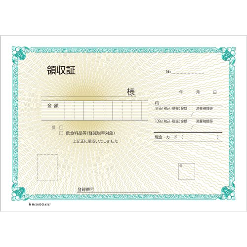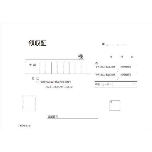 ヒサゴの定番領収証です。●サイズ/B6※ヨコ●寸法/タテ128×ヨコ190mm●ミシン目切り離し後寸法/タテ128×ヨコ180mm(B6※)●組数/50組●複写枚数/2枚●軽減税率/対応●単位/1セット10冊入