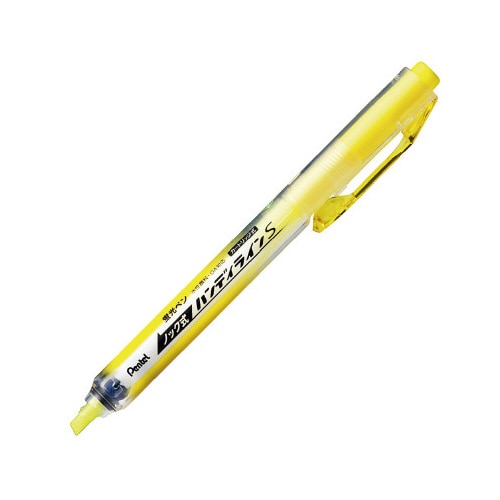 キャップをなくす心配なし。片手ですぐにチェック!●線幅/平芯:1.0ー3.5mm●ペン先/平芯●インク色/イエロー●インク種類/水性顔料インク(OA用紙対応)●インク方式/中綿タイプ●材質/軸・ノック:再生PP●種別/シングル●タイプ/ノック式●仕様/詰め替えタイプ●カートリッジ/XSLR3-G●単位/1本