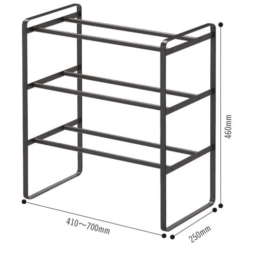 玄関スペース、靴の量によって、41から70センチに伸縮!●種別/3段●カラー/ブラック●外寸法/幅410ー700×奥行250×高さ460mm●有効内寸法/高さ(床から1段目)132mm(2・3段目)127.5mm●材質/スチール(粉体塗装)●質量/2kg●耐荷重/1段あたり:約3kg●付属品/連結パーツ●生産国/中国●組立/お客様組立商品●単位/1台