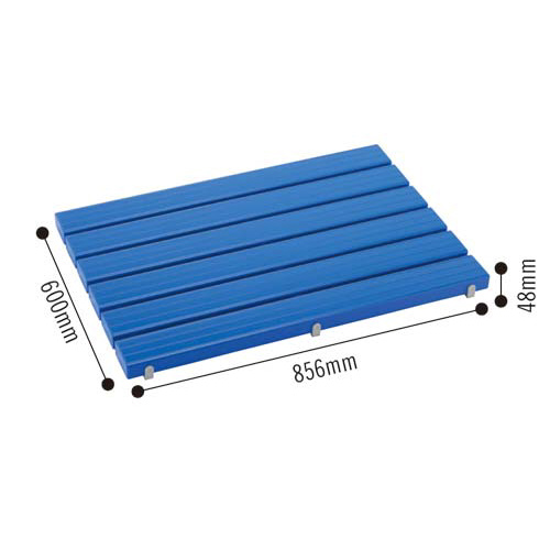 エンドキャップの付いた安全スノコ。●種別/奥行600、幅856●カラー/ブルー●幅/幅856●奥行/奥行600●外寸法/幅856×奥行600×厚さ48mm●材質/PVC(抗菌防カビ剤配合)●質量/4.9kg●機能/防炎●付属品/エンドキャップ付き●生産国/日本●組立/お客様組立商品●単位/1枚