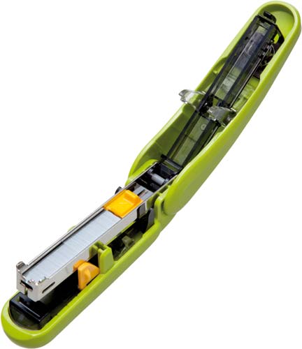 ステープラーも人気カラーでやる気アップ!ゲージつきで紙をズラさず綴じられる!●寸法/幅25×長さ96×高さ48mm●使用針/10号針(NO.10)●とじ奥行(最大)/3から20mmまでの7段階●とじ枚数/約20枚●カラー/グリーン●装填数/100本●材質/ハンドル:再生PS●単位/1個