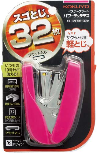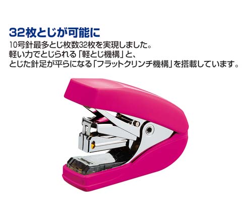 軽とじ機構搭載で、いつも使用している10号針で32枚もの書類を軽くとじることができます。とじた針足が平らになるフラットクリンチ機構。女性の手でもすっぽり収まるコンパクトさで、針を100本装填可能です。●カラー/ピンク●寸法/幅29×長さ80×高さ64mm●とじ奥行/最大22mm●針装填方式/ワンタッチオープン方式●装填数/100本●使用針/10号針(No.10)●とじ方式/フラットクリンチ●とじ枚数/約32枚●機能/リムーバー有●材質/カバー:再生ABS●付属品/針別売●単位/1セット(3個入)