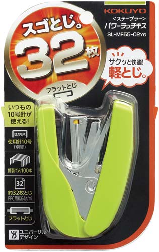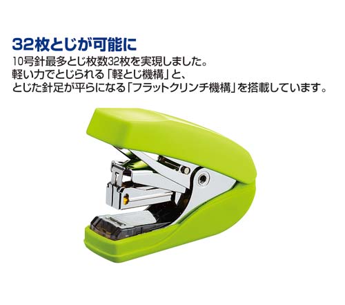 軽とじ機構搭載で、いつも使用している10号針で32枚もの書類を軽くとじることができます。とじた針足が平らになるフラットクリンチ機構。女性の手でもすっぽり収まるコンパクトさで、針を100本装填可能です。●カラー/黄緑●寸法/幅29×長さ80×高さ64mm●とじ奥行/最大22mm●針装填方式/ワンタッチオープン方式●装填数/100本●使用針/10号針(No.10)●とじ方式/フラットクリンチ●とじ枚数/約32枚●機能/リムーバー有●材質/カバー:再生ABS●付属品/針別売●単位/1セット(3個入)