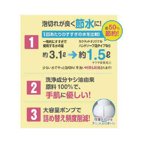 ※パッケージが予告なく変更になる場合があります。※詰替えには必ず「カウネット ハンドソープ 泡タイプ(無香料)詰替用」をご使用ください