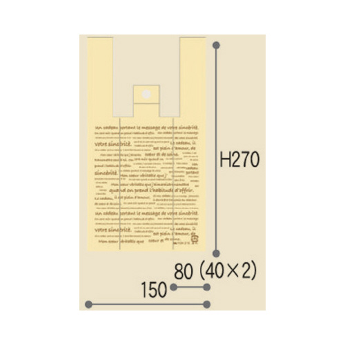 柄付でオフィスでも気軽に使えるレジ袋●サイズ/SS●機能/片面印刷●総幅(仕上幅+マチ)×高さ(mm)/230(150+80)×270●カラー/クリーム(半透明)●材質/高密度ポリエチレン●厚さ/0.015mm●生産国/日本●仕様/A スタイル●単位/1パック(100枚入)